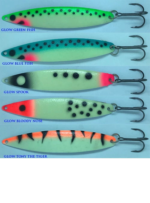 4-1/4″ length glow with white back trolling spoons made in Duluth, MN